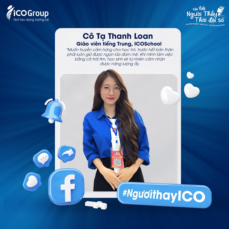 Thuộc thế hệ giáo viên trẻ của Trường TH, THCS và THPT ICOSchool, cô Tạ Thanh Loan - sở hữu chứng chỉ HSK6 và HSKK cao cấp - đã nhanh chóng ghi dấu ấn trong công tác giảng dạy với tinh thần luôn tràn đầy năng lượng.