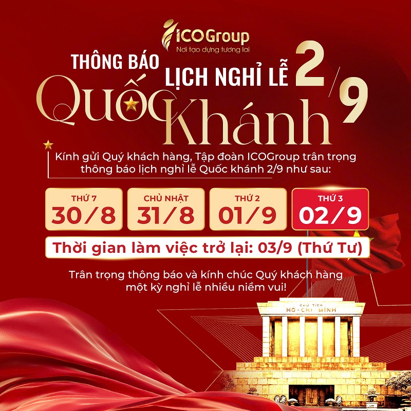 Tập đoàn ICOGroup trân trọng thông báo đến Quý Khách hàng, Quý Đối tác lịch nghỉ lễ Quốc Khánh 2/9 như sau:
