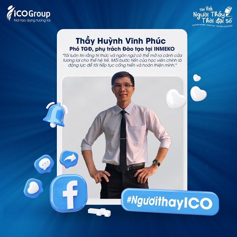 Bắt đầu đồng hành cùng ICOGroup từ năm 2015, thầy Huỳnh Vĩnh Phúc thuộc đơn vị INMEKO - là một trong những gương mặt tiêu biểu của hệ thống với hơn 10 năm tận tâm trong lĩnh vực đào tạo ngoại ngữ và du học.